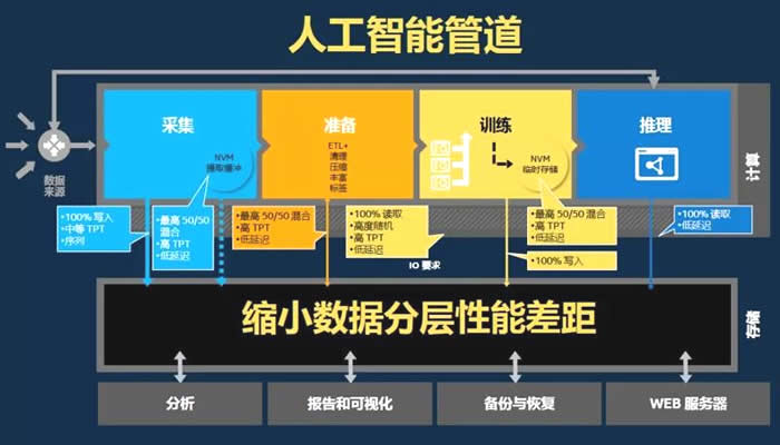 “工欲善其事,必先利其器”,要想發揮出AI人工智能技術的大威力,需要企業構建強有力的IT基礎設施。這個設施不僅需要強有力的處理器、FPGA、GPU,也需要G性能的存儲設備,否則就會如普通電腦一般,因為機械硬盤傳輸速度慢,尋找數據的時間長,往往會成為整個係統性能的瓶頸,即使是SATA/PCIe NAND SSD,很多時候也跟不上AI數據處理的需求。倪錦峰先生介紹到,無論用於哪個行業,人工智能的工作實際上主要由采集、準備、訓練和推理四部分組成。每個部分需要讀寫不同類型的數據,工作負載也不盡相同,將給存儲設備帶來較大的挑戰。