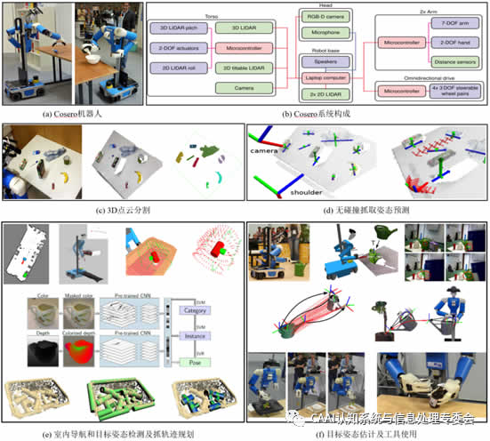 Cosero[1]是德國波恩大學的Sven Behnke團隊根據家庭環境中的日常操作任務而研製的一款仿人操作機器人(如圖1(a)(b))。機器人底部配備了四輪獨立轉向行走機構,以便在靈活的通過狹窄通道,上部配備了兩個7自由度機械臂已完成擬人的操作,並在夾持器末端裝有紅外測距傳感器已達到對抓取目標的距離探測,在D端安裝有Kinect相機,以實現對目標環境的3D感知。Cosero通過底盤的激光雷達進行導航和定位,采用法線估計和場景分割相結合的方法對目標進行3D點雲分割,采用無碰撞抓取方法[1]對目標物體進行抓取(如圖1(c)(d))。在論文[2]中,作者運用Cosero進行零件分揀搬運實驗,通過2D激光雷達導航到作業點,通過RGB-D相機對目標進行識別分割,規劃抓取路徑和抓取姿態估計(如圖1(e))。在論文[3]中,作者采用深度學習方法對目標進行姿態估計,並完成了提壺灌溉,人機交互和使用工具等複雜任務(如圖1(f))。Schwarz[4]介紹了Cosero基於深度學習方法的目標姿態估計和RGB-D SLAM等感知測量。